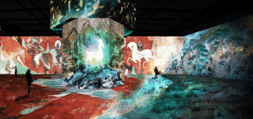 “遇見(jiàn)敦煌 光影藝術(shù)展”將敦煌石窟壁畫彩塑與光雕投影技術(shù)相結(jié)合,讓人瞬間有穿越千年之感,仿佛身臨其境來(lái)到莫高窟,見(jiàn)到了真實(shí)壁畫。